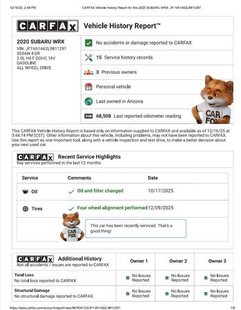 Super clean and unmodified 2020 Subaru WRX. Just serviced by Camelback Subaru. New oil/filter, clutch, front struts and tires. 68k miles. Clean CARFAX. 6spd manual. If this ad is still up, Car is...