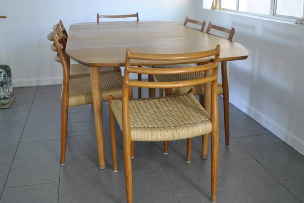 Set of six dining chairs by Niels Otto Moller For J.L. Moller, Denmark, 1950s. Model 78. A sleek and stylish set of Teak dining chairs with Rattan seats and ladder backs.
