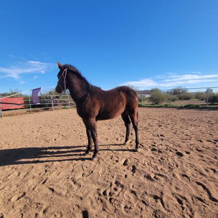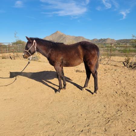 AQHA registered filly, color tested smokey black with white snip. Quiet, willing, and well started on baby basics. Handles well on the ground, easy to catch, lead, and work around. Nice mind and solid foundation to go any direction. Priced to sell at $4,000 OBO. Dam and Sire pictured in add. Estimated to mature at 15h.