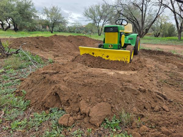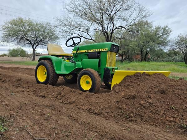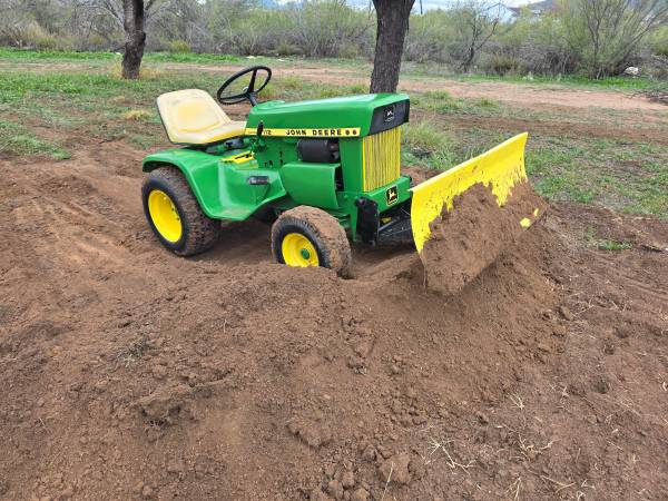 Here is a strong running heavy duty garden tractor John Deere 112. Great for clearing land and grading the road after those monsoon rains and cleaning the corrals. Comes with front dozer blade that angles left and right and rear mounted tiller. Tractor is located in Tucson. Phone calls only. $3,000.00 (I will remove the listing when sold) (52o)24o-oo21
