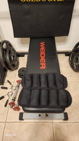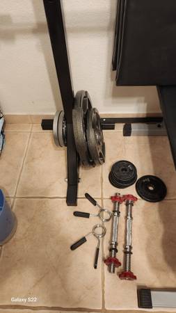 Olympic bar, plates, squat rack, flat bench, ankle weights, exercise mat...all in excellent condition..must sell..no longer lift, and need the room. This is a real bargain! You must pick up...will...