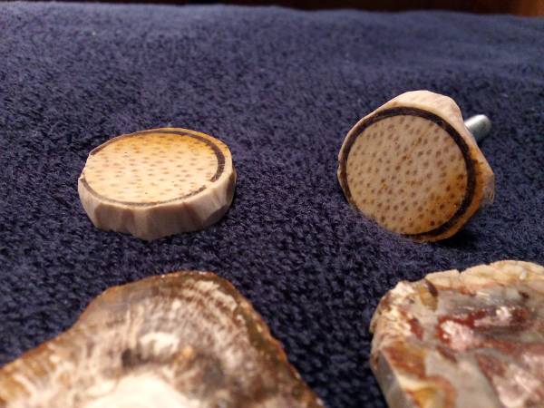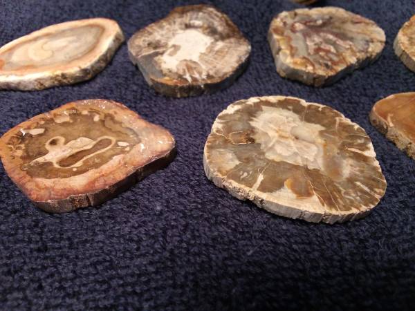 These were found in a tray mixed with various types of gemstones. I guess my dad considered these nice enough to use for something in the future, and it looks like he was starting to work with a couple of round pieces. I'm not a gemologist or rockhound who would know exactly what this is but my mother believes it's fossilized palm, but someone online thinks they may be petrified wood, so I'll let you decide. Each one of these has a smooth polished side which makes it ready for use in jewelry.