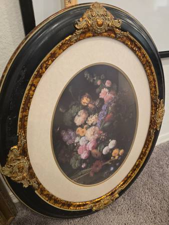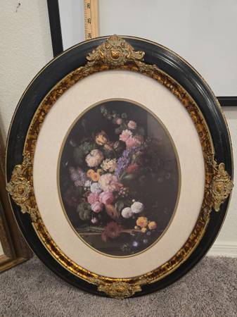 3 large pictures with frames. Selling 3 for 100, or if you want just one, 100 each. See the yard stick in the photos to get a rough idea of their size. Two rectangular and one oval. Art features children, puppies, and flowers.