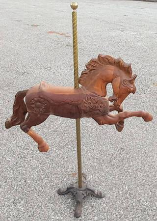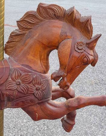 Antique carousel horse (full size) carved by Mexican Master Craftsman. A family member purchased it from a prominent antique dealer in Northern Cal in the 1980s. Presumed to have been carved 20 or 30 years earlier. Has an expertly carved detailed parade/display side, and a more sedate carousel interior side. Mounted on a stand and fully free-standing. Self-supported by base and pole, over 6 feet tall. 4 feet wide - tail to front hoof, 57 inches high - floor to top of mane. Includes intricate patterned cast iron base.