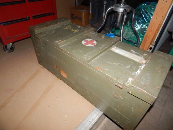 Vintage 1960’s wooden chest. Originally used by Czechoslovakian military for the safe storage of medical and first aid supplies in the field.