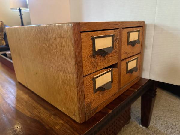 Vintage 4 Drawer Oak Library Card Catalog Cabinet. One drawer chipped as pictured. Each drawer has a copper colored sliding card holder. Great for decorating or use for a recipe holder. 3201 E...