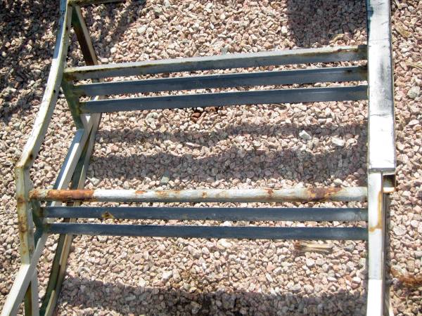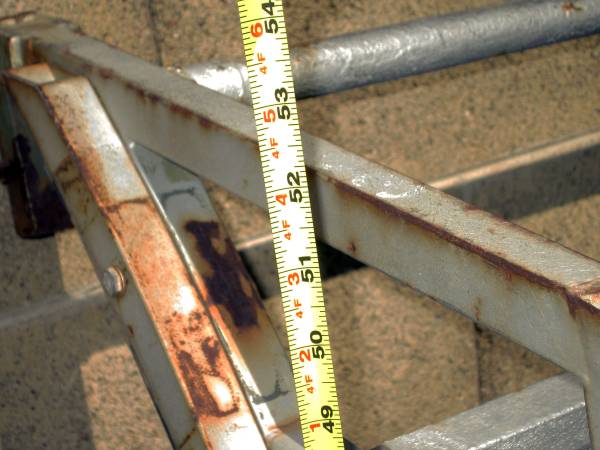 Made of steel, 32" wide x 52" or so high. Painted steel (minor surface rust in places) with non-slip coating applied to the rungs.
