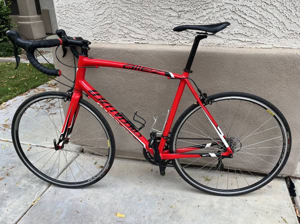 Specialized Allez Sport 58 cm road bike. FACT carbon fork. Shimano Sora 9 speed drivetrain, components and SPD pedals. Good condition. Some paint scratches. Two bottle cages.