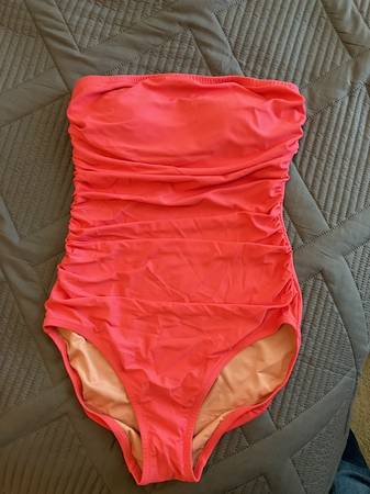 Brand new, never worn ruched bandeau one-piece swimsuit from J. Crew in sold out color Brilliant Papaya. Gorgeous tropical color in high quality J. Crew material. Full-coverage bottom, low-cut leg and high-rise back. I scored one on sale, but it is a bit too long for me and I can't return it. I am 5' 2" and usually wear size 4 and 2 in most clothes and swimwear but feel this style would fit someone 5'4" or higher. $45 cash (That's what I paid for it on sale)