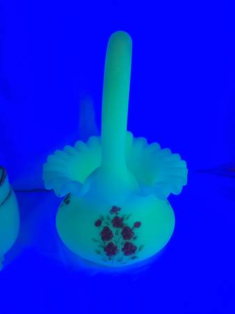 Includes one Fenton glass vaseline glowing basket (7" tall), as well as a Fenton cranberry piece (6" tall) and a Fenton perfume piece. Also includes a large Fenton basket (with repaired/glued handle), a Nor-So bowl, and another glowing vaseline piece, which is a toothpick holder.