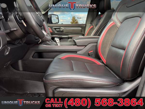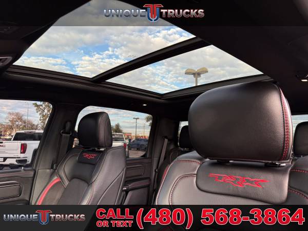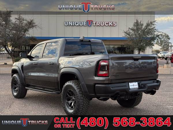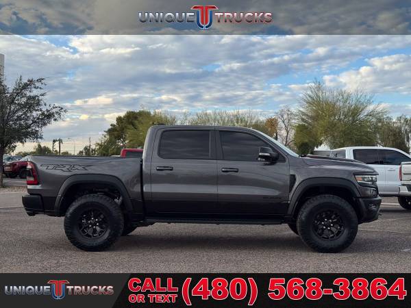 Check out this clean one owner 2022 Ram 1500 TRX Crew Cab 4x4 that makes a strong first impression the second you see it. Finished in Granite Crystal Metallic Clear Coat with matte black accents, this TRX has a bold look that stands out without trying too hard.Under the hood sits the highly sought after 6.2 liter supercharged HEMI V8 SRT engine paired with a smooth 8 speed automatic transmission. This setup delivers fast response and serious power, making this truck feel just as strong on the road as it looks parked.This TRX rides on brand new 37 inch tires that give it the perfect stance and fill the wheel wells just right. The wider look adds to its tough feel and helps set this truck apart from the rest.Inside, the black leather TRX interior is finished with sharp red trim that gives the cabin a sporty feel. The seats are comfortable and supportive, making long drives just as enjoyable as quick trips around town.The Level 2 equipment group adds a long list of comfort and tech features, including ventilated and heated front seats, heated rear seats, a heated steering wheel, head up display, digital rearview mirror, and memory settings for the driver seat, pedals, and mirrors.Technology is front and center with the large 12 inch touchscreen running Uconnect 5 with navigation, performance pages, and drive modes. The 19 speaker Harman Kardon sound system fills the cabin with clean sound, while wireless charging keeps your phone ready to go.Safety and control are built in with adaptive cruise control, lane keep assist, pedestrian braking, blind spot monitoring, front and rear park assist, and a rear back up camera. High performance brakes and adaptive damping help keep everything planted and controlled.This TRX is ready for work or play with a spray in bedliner, deployable bed step, adjustable tie downs, power tailgate release, trailer brake controller, and a Class IV hitch. The full time 4WD system and locking rear axle make towing or off road driving feel easy.Extras like the carbon fiber interior accents, flat bottom steering wheel, panoramic sunroof, off road style running boards, and TRX graphics finish off the look and feel of this loaded truck.This clean 2022 Ram 1500 TRX with the Level 2 package has been fully serviced and is ready for its next owner. Unique Trucks offers no obligation delivery right to your door, at home test drives, easy phone deals, and we love trade ins, so come check out our trucks and lifted trucks today. _____________________________________________________________________________________ 2022* RAM* 1500* TRX* 1500 CREW* TRX EDITION* CREW CAB* 6.2 LITER SUPERCHARGED* LIFTED TRUCKS* RAM TRUCKS* TRX EDITION* SUPERCHARGED* GAS TRUCKS* 1500 TRUCKS* RAM TRUCKS* DODGE TRUCKS* LOW MILES* LOW MILEAGE* RELIABLE* ONLY*