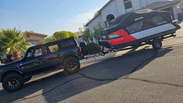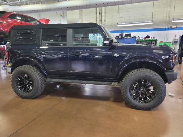 This Bronco is in excellent condition with no issues at all. SanTan Ford installed a 4 inch ReadyLift kit, 37 in Falken Tires on beautiful 20 in Rims. (The absolute biggest you can get and still fit in a standard 7 foot high garage) The tires alone are as tall as a sport bike! The running boards were shortened to ensure no tire rub at all and still look absolutely factory. Theres a rough country spare tire reinforcement kit to accommodate the weight of the full sized matching spare. The outer banks package includes the large touch screen (absolute must have) and upgraded premium B&O sound system with factory subwoofer in the back swing gate. I added a towing package for the boat that includes hitch and full wired setup. Velocity blue is a rare stunning metalic only offered for this model year.