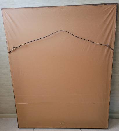 The painting is acrylic on masonite board. It is signed in the lower left corner with his name and also his family brand. It is approximately 24” x 37”, and the overall size in the frame is approximately 44” x 34”. There is one small dent in the frame, as pictured.