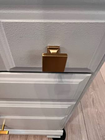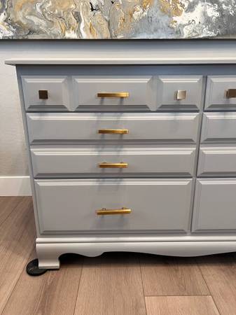 50” Wide Solid Wood Greige Dresser w/ 6 Dovetail Drawers & NEW Brushed Brass Gold Handles. Selling this Freshly Painted Greige dresser! This piece was recently restored and painted a custom mix color of Greige. In some lights it leans grey, in other lights it leans taupe/beige. This is so cute and literally in near perfect condition! This is solid wood with 6 Large dovetail drawers. The dovetail drawers are sturdy and slide perfectly. Love the cutout wood designs on frame!