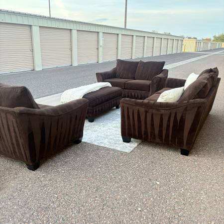 ποΈ Cozy brown corduroy living room set featuring a sofa, loveseat, chair, and ottoman β all with a soft, textured fabric thatβs stylish and comfy. Perfect for family rooms or everyday lounging with plenty of seating space.