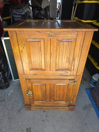 Large cabinet with an antique ice box exterior. Does not have the ice box interior, just regular wood. Would work well as a pantry or general cupboard. Has a reinforced lower door (reinforced on the interior with steel brackets).