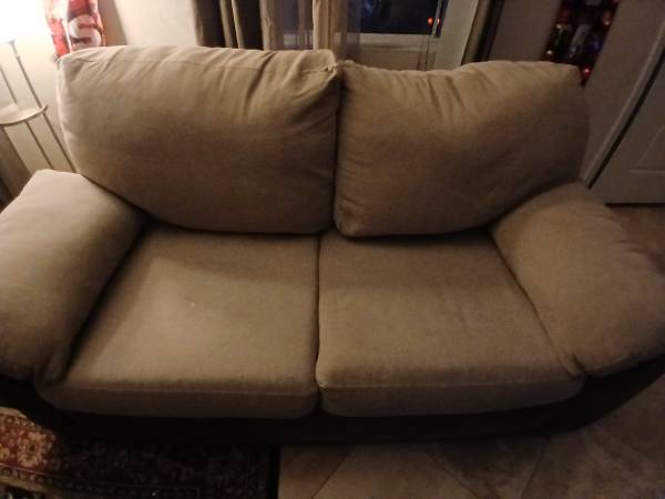 Less than 2 yrs old, 7 1/2' Couch & 5 1/2' LoveSeat, Light Tan w/Brown on bottom, No tears or stains, legs can come off, some cat stratches. Velcro back cushions make easy cleaning & 4...