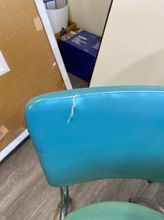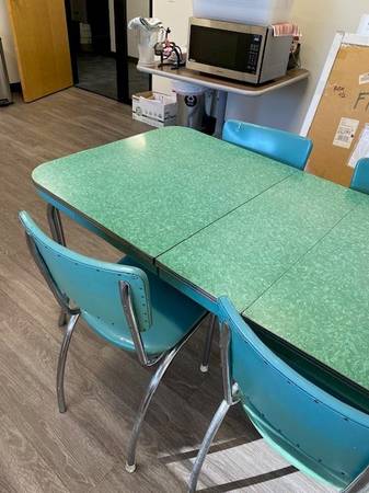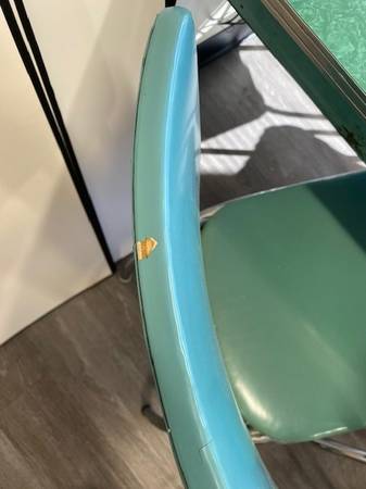 Vintage 1950s Blue/green Formica and Chrome dining table and four chairs. All in good condition. Two chairs have small tear issues, as illustrated in the photos. This set was purchased in the mid-1990s from a Glendale antique store and has had limited use in a law office. NOTE - THE ANTIQUE RADIO IS NOT INCLUDED AND IS NOT FOR SALE.