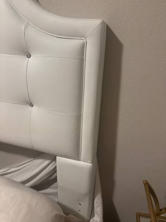 It Faux white leather, with tufted crystal accents.