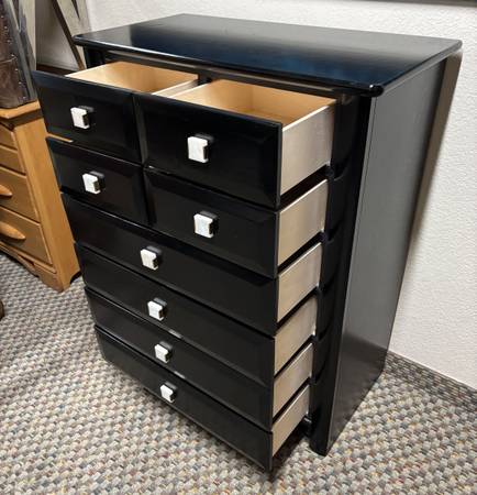 Black chest of drawers all drawers slide smooth 18x35 inch top 45 inches tall scratches from normal wear good condition $60 call