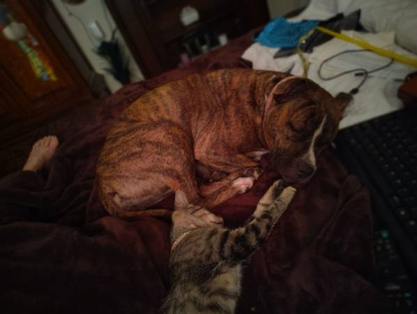 She's actually a very good dog and she does get along with other dogs normally, I take her to the dog park and have never had any problems. But this dog is very aggressive and tries to be the alpha with her and she's not having it. She's very lovable loves to hug and has been a great comfort to me when I'm sad. She loves ppl has never bit a person. She especially loves men.
