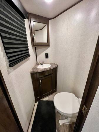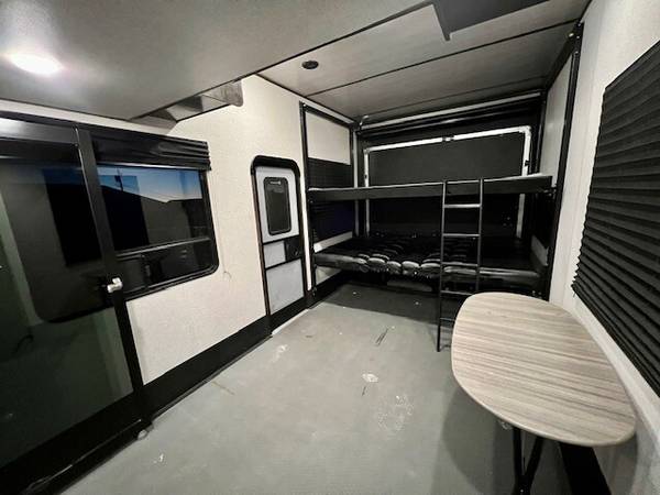 New Batteries! 3 slides, 2 bath model, 15? Garage with 2 power bunks, Full size master bedroom closet with queen bed, sleeps 8-9, 2 AC's, low step shower, Double door fridge, stainless appliances, Onan 5.5 kW gas generator (581 hrs), Prepped for cable/satellite, 18? Electric Awning, Hydraulic self-leveling jacks, basement storage, fuel station, loft bed, exterior Folding ladder, Loaded weight 16,800, unloaded weight 14,260 lbs. 2 NEW TV'S, no smokers, like new.