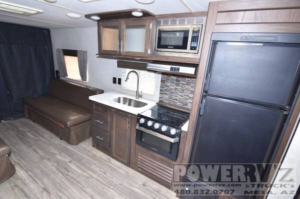 This unit is equipped with 30 amp service, a roof mounted A/C unit, a furnace, a solar charge port, and a power tongue jack. It has a power patio awning, exterior marine grade speakers, solid flip out entrance steps, an outside shower, rear view camera prewire, LP bbq hook up, and a front exterior storage compartment.