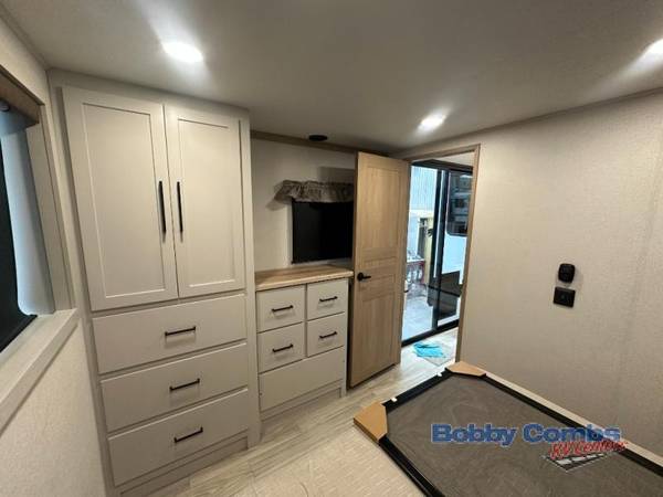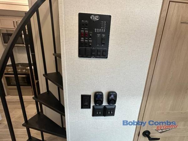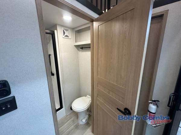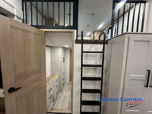 You won't believe the comfort and convenience found in this destination trailer. There are two private bedrooms; one up front with a queen bed slide out and storage space, and one in back with a queen bed slide out and a half bath! There is even washer and dryer prep here if you want to add those appliances and the second entry door is also found in this location so you can easily slip out in the morning. Above each of these rooms is a loft providing three total bunk mats for sleeping, storage cabinets, and TV prep if you want to add entertainment. Everyone can meet in the combined kitchen and living room that includes dual opposing slides, a 60" theater seating across from a 50" flat screen TV and fireplace, plus a free-standing table with chairs and a bench to dine at. The chef of your group will love the large kitchen island, Chef Collection three burner range, and a 16.2 cu. ft. refrigerator for food storage.Â