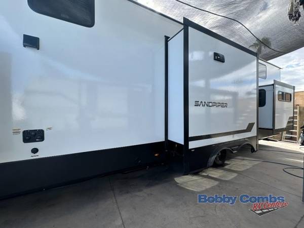 With each Sandpiper Destination Trailer by Forest River you will enjoy many luxurious features, such as crown molding over the kitchen cabinets, solid surface kitchen countertops, a memory foam mattress, plus so much more. The extra large picture windows throughout let natural light in and provide beautiful outdoor views, and each model includes three or more slides for added interior space. You'll find many exterior conveniences, like the porch light with an interior switch, the rain gutters with extra long drip spouts to prevent black streaking, and an electric awning with LED light strip, plus more! You will stay comfortable year around with dual 15,000 A/C units plus each model is constructed with an Underbelly Armor for better protection and insulation!