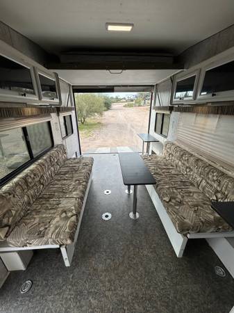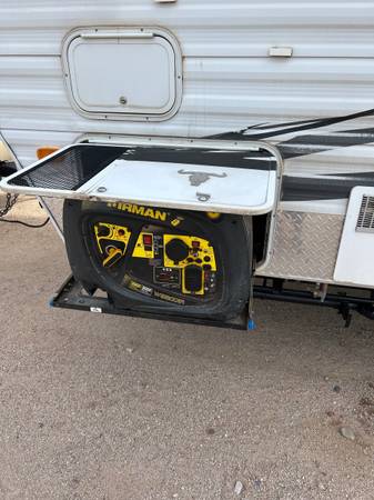2007 Carson titan 26 foot overall length tongue to rear of trailer box is 22 feet, cargo area is 82 inches wide by 12 feet 8 inches length for toy, half ton towable, excellent condition well maintained, low hours, used only a couple times a year been in family since new. New awning, new tires, new led lights, newer skylights, has 25 gallons gas tank 25 gallon grey tank optional 100 gallon fresh water tank and 30 gallon black tank. Original generator was loud no longer on board has roll out storage now for generator in picture generator is not included. Every thing works ac heat water heater small bath with shower and toilet outside shower. Sleeps 4 comfortably can sleep 6 if add air mattress where bikes go. No leaks has full metal roof easy maintenance. Has dual window shades depending on how much light you want.
