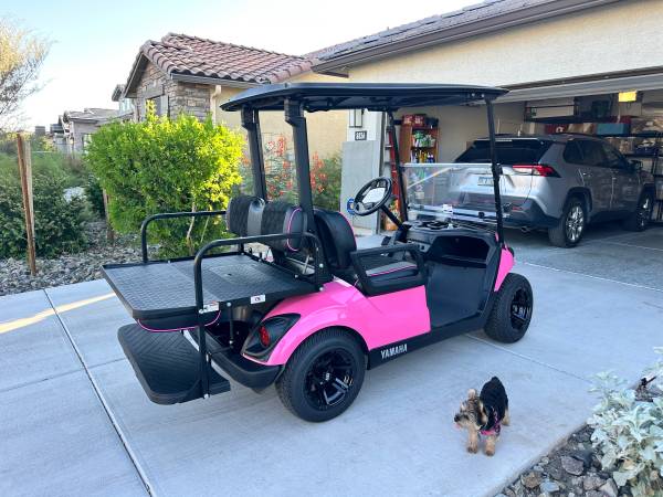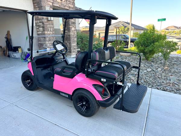 Super clean mint condition Electronic Fuel Injection Yamaha Quiet Tech golf cart with brand new 12” wheels offers a smooth and quiet drive . Comes with gorgeous Marine grade perforated (very durable and breathable) dimond stitch suede, pink pro paint body color. Ask any owner of a Quiet Tech any they will say it is the best gas cart in the industry: dual USB charging ports and independent suspension, and only 10 decibels louder than an electric cart and has 300 mile range per tank! Extremely reliable-Needs the least amount of maintenance in the golf cart space. Rear flip down seat can be taken off to make it a 2 seat golf cart. I have a title in hand, no trades, can deliver.