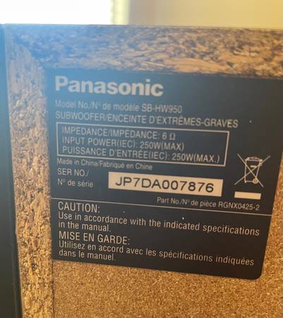 This is an attractive Panasonic Subwoofer in excellent working and cosmetic condition. It is a 6 Ohms, 250 Watts and measures approximately 171/4" x 7" x 13" and weighs ~12 lbs. 10 oz. speaker wires are attached.
