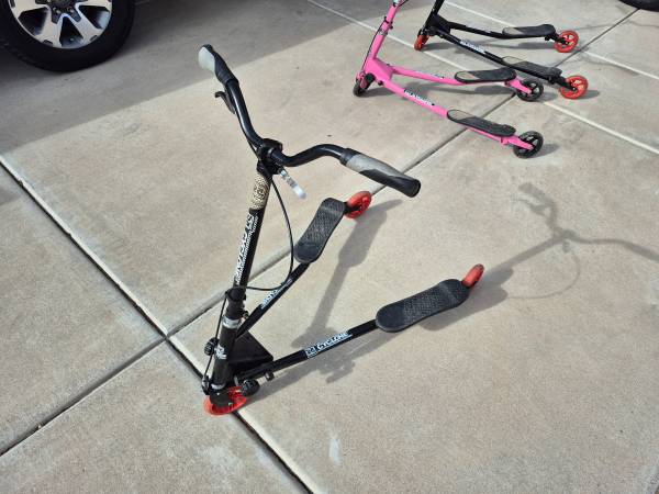 We bought these unique scooters in Brazil. They work by shifting your weight from side to side. $50 each or $100 for all three.