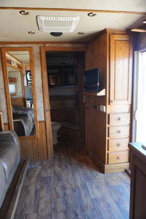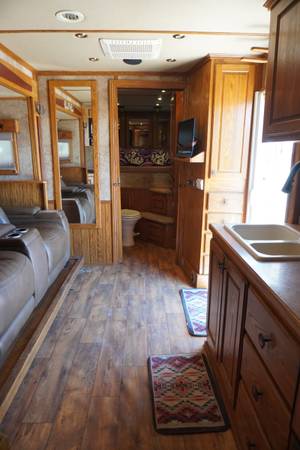 This 2007 Elite Trailers 15' SW 3 Horse tailer features mangers, hay pod, escape door, drop down windows on both sides and rear tack. The tack area features a stationary saddle rack, swing out blanket bars, lots of bridle hooks, brush bucket and is fully carpeted. The horse area is a rear load with a ramp leading to padded stalls, one being a Stud Wall, rubber lined with pop up roof vents. Living quarters features a slide out with sofa, TV, stereo and front bathroom with sink, medicine cabinet, shower and toilet. The bunk area includes mattress, TV and storage areas. Kitchen has sink, stove, microwave, fridge, pantry, Walk Thru, generator and ducted AC throughout Living Quarters.