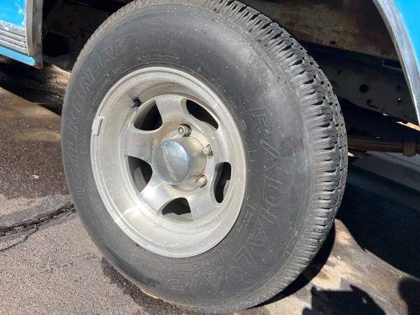 Four aluminum wheels with caps off a Ford F 100. Will also fit G and Dodge with a 5×5.5 inch bolt pattern. Tires are old and will need to be replaced. Wheels are in great shape. No curb rash