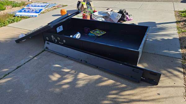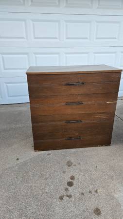 Twin Bed and trundle need new paint, very rugged! On the driveway with hardware. Glasses set of 12, shelves and dresser - good for storage or garage