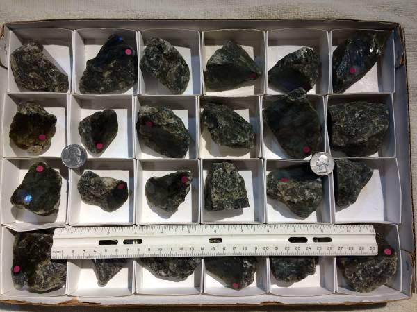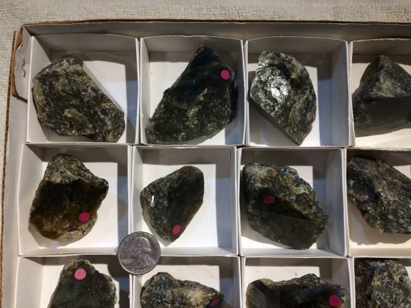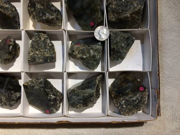 FOR SALE: 24 mirror polished Madagascar Labradorite pieces. Same estate as the other listings. Quarters and ruler in pictures for size comparison. The little white boxes measure 2 1/4 x 2 1/2 inches. Email me back with any questions. Please check out my other listings of rough rock and polished pieces. Thanks for looking.