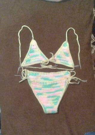This cute little bikini was handmade back in the late 1980s for my daughter by her Godmother. It is crocheted with multi-colored yarn and has ties on the sides of the bottoms and ties for the neck and back on the top. It was worn by my daughter when she was little, but appears to be in great shape. I just washed it and it came out of the washer looking just fine. I don't remember how old my daughter was or what size it might have been, so I took pictures with a ruler to help determine what size girl it would fit. Keep in mind that due to the tie/bow closures, it can be adjusted and used by various sized girls.