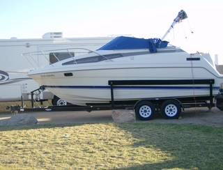 Mercruiser 260 hp 5.7 L fuel injection Alpha one drive. New Bimini top, New batteries. Battery charger, inverter /charger-800w, stereo, range-electric/c.n.g., refrigerator,-AC/DC, shore power. Rebuilt carburetor, new water pump, fuel pump, oil and filter, lower unit serviced new impeller. Has bathroom, sink sleeps four great for small family. 25 foot tandem trailer with new brake assembly. Boat and motor very sound. Needs seat covers. ANY REASONABLE OFFER COSIDERED .