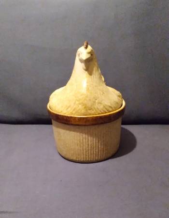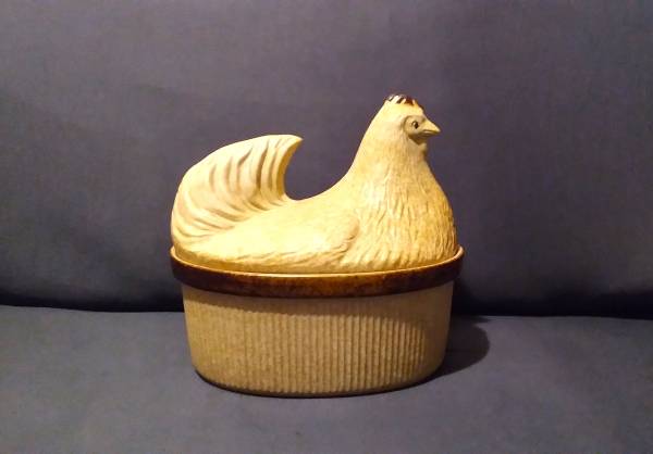This cute little hen will sit on her nest while baking your chicken, casserole or other favorites. I know that I used it once (or maybe twice) many years ago, but it has been sitting on a shelf as a decoration for decades. It measures about 10 inches long, about 10 inches high and about 7 inches wide.