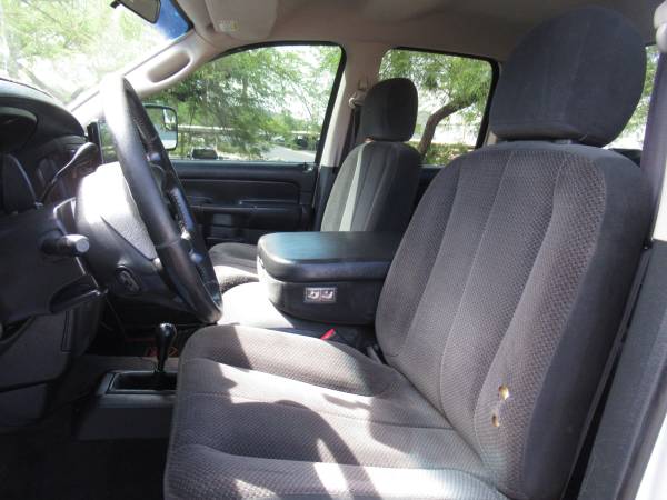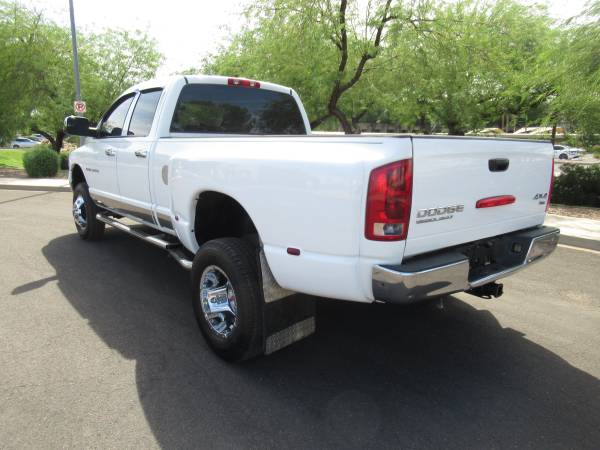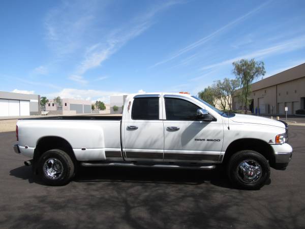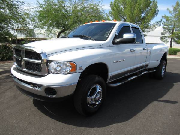 2003 Dodge Ram 3500HD SLT Quad Cab 5.9L Diesel Dually 4X4 137K Miles!! Beautiful truck with white exterior and dark gray cloth interior, 137k miles, sitting on 6 like NEW Michellin tires and 17" custom chrome aftermarket wheels, ice cold A/C, ABS, cruise control, premium sound aftermarket touch screen radio with back up camera, on board air bag suspension, running boards, tow package, tinted windows, power windows, power locks, power steering, power mirrors, bed liner with V&W gooseneck ball and more!!!!!