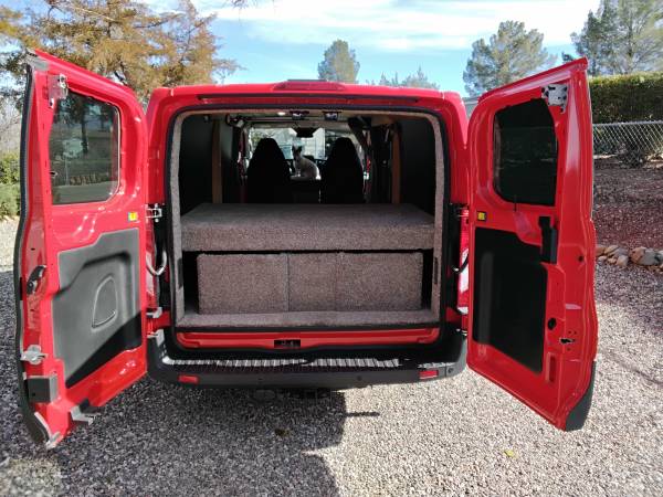 Custom interior build: Full-size bed platform with three large, sliding drawers (accessible from inside or out the rear doors). The bed and drawers are fully removable in about 5 minutes—no permanent ll camper conversion. The van is ideal for overlanding, road trips, or van life.