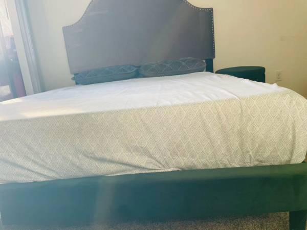 This Queen bed set was matched and assembled by us, and everything is in great condition with no issues. One of the biggest advantages is that the headboard is much tall to 60” and adjustable for lower if needs, which looks very elegant. The bed frame does not require a box spring, and the overall height is very comfortable — not too low and not too high. This is a complete set, including the bed frame and a matching side table, so you can move it in and use it right away. We are happy to help with installation since we are familiar with the setup.