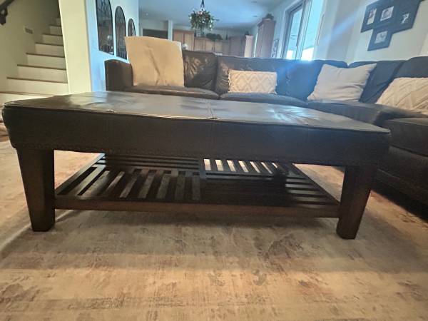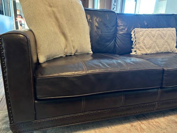 100% real leather chocolate brown sectional and matching ottoman. It is 9’x9’ from non-smoking home. Stud detailing around the arms and bottom of couch and stitching along the cushions. Must be able...