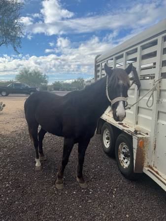 Seven (+\-) year old gelding. 15.1-15.2 hands. Chocolate with flaxen mane and tail. This horse ropes, works cattle, trail rides, packs and more. Ride him alongside traffic or in a parade. Gentle as a horse can be with a nice way of going. Sound with plenty of stamina. Easy to catch. Not many of these kinda horses around. Got too many in the herd and need to move one. Eighty five hundred. In Cave Creek.