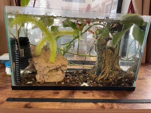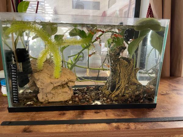 Frameless 10 gallons aquarium including decorations; filter, air bubbles and guppy fish Pick up location: 124th street and Shea blvd