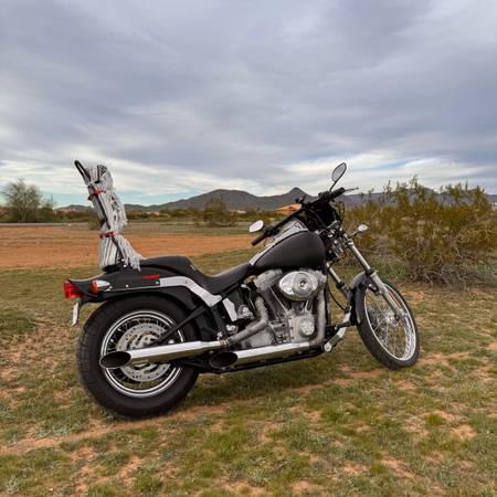 2005 Black Harley-Davidson motorcycle with a matte black gas tank, black sissy bar with a gray blanket strapped to it, and chrome exhaust. 1450cc (88 cubic inch) Twin Cam 88B V-Twin engine