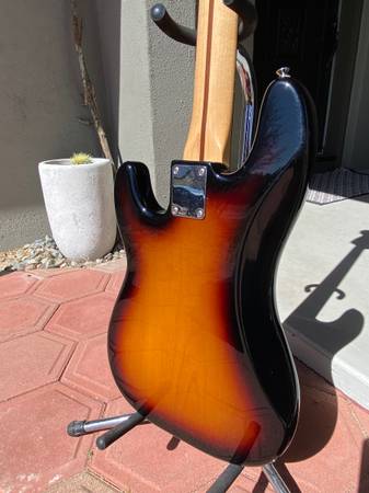 This is a great playing 2013 Made in Mexico Fender Precision Bass. The neck has a great feel to it, semi gloss finish and great playability up and down the neck. The truss rod was just adjusted and the fretboard oiled. The grain on the fretboard as well as the body is nice. The stock pickguard was changed to Tortoise Shell and a Thumbrest was installed to give it that 1960s Vibe. The stock pickups were changed to Seymour Duncan Quarter Pounder Pickups and the body cavity and rear of the pickguard was copper shielded. I do not have the original parts. It currently is wearing some neon strings but previously had flats on it so the the frets are in great shape with barely any wear to them. The neck has a few small dings around the headstock if you look hard for them, but the rear of the neck is very clean. The body also has some dings and scratches, lots of small ones on the back but no chips, cracks or missing finish. I also noticed the plastic pickup cover has some wear around the height adjustment screws. Overall a nice P bass, truly needs nothing except a new home and maybe your preferred strings. Best of all it's very light! see photos for its weight on my accurate postal scale. Includes a nice Roadrunner Gig Bag and Wide Lekato Strap.