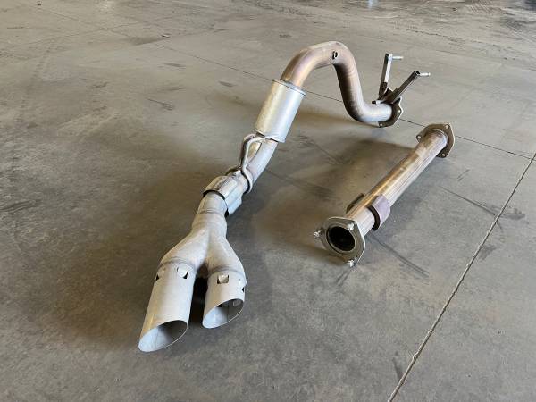 This is a Stock DPF-Back exhaust from a 2017 Ford F450 Crew Cab, Long Bed 6.7L Powerstroke Diesel pickup. There are no dents or damage, the tips are not crushed. Should fit 2018-2019 trucks.