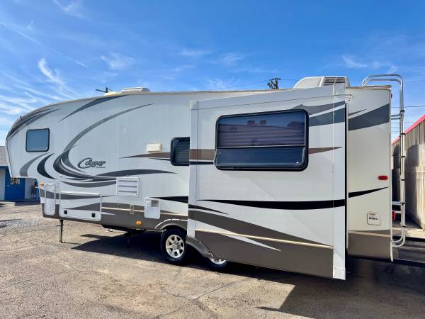 2013 cougar 282RESWE 30ft fifth wheel with 2 large slideouts lite weight half ton towable good tires large awning 2 ducted A/C units and heat refrigerator and freezer microwave stove oven large bathroom with glass shower walk around queen bedroom lots of cabinet and closet space non smoker no pets in excellent condition in and out clean title for more info call 6025596579 no emails